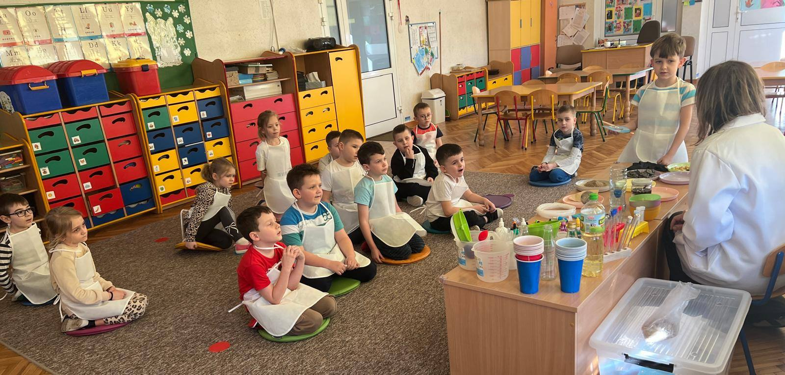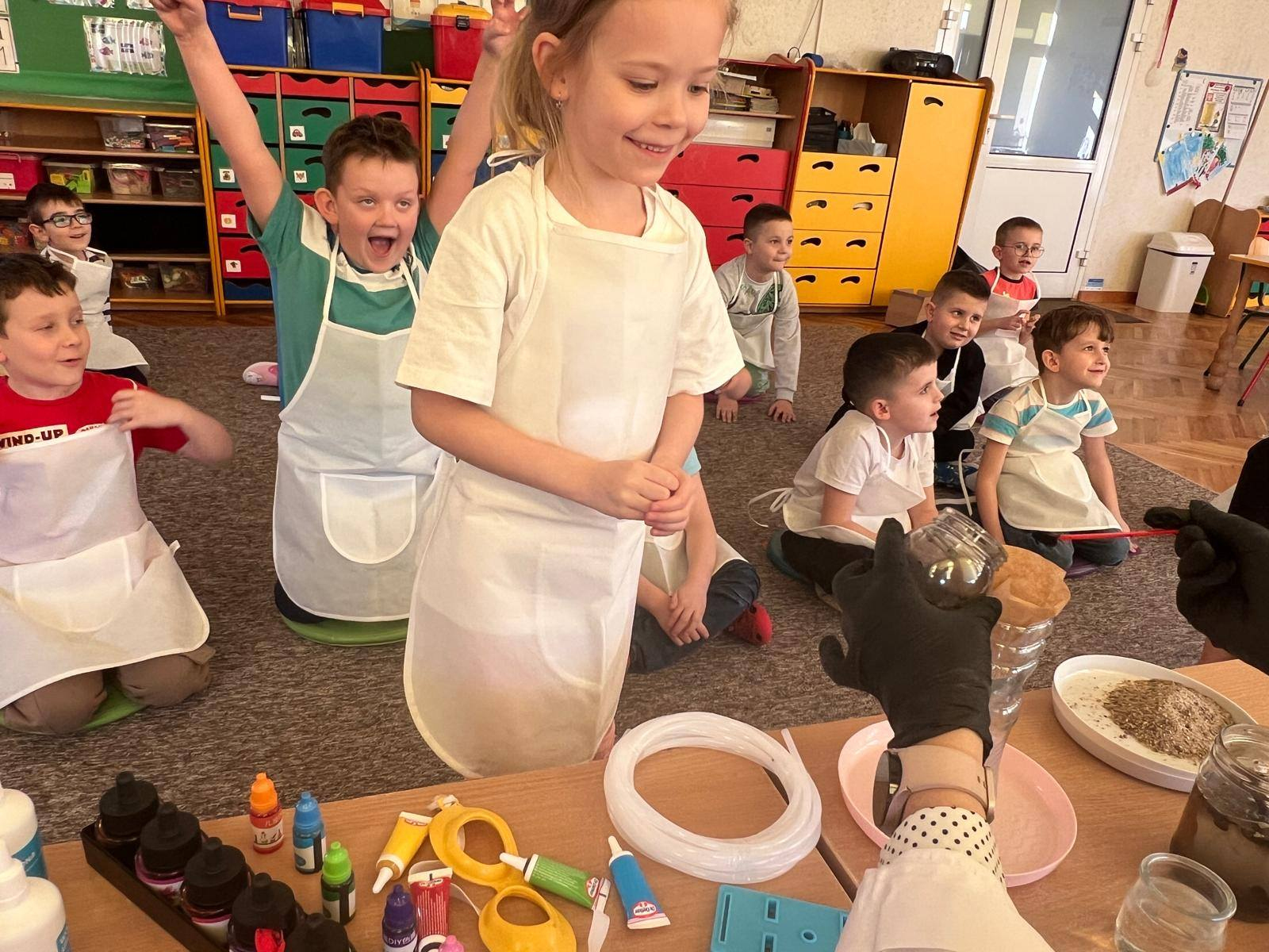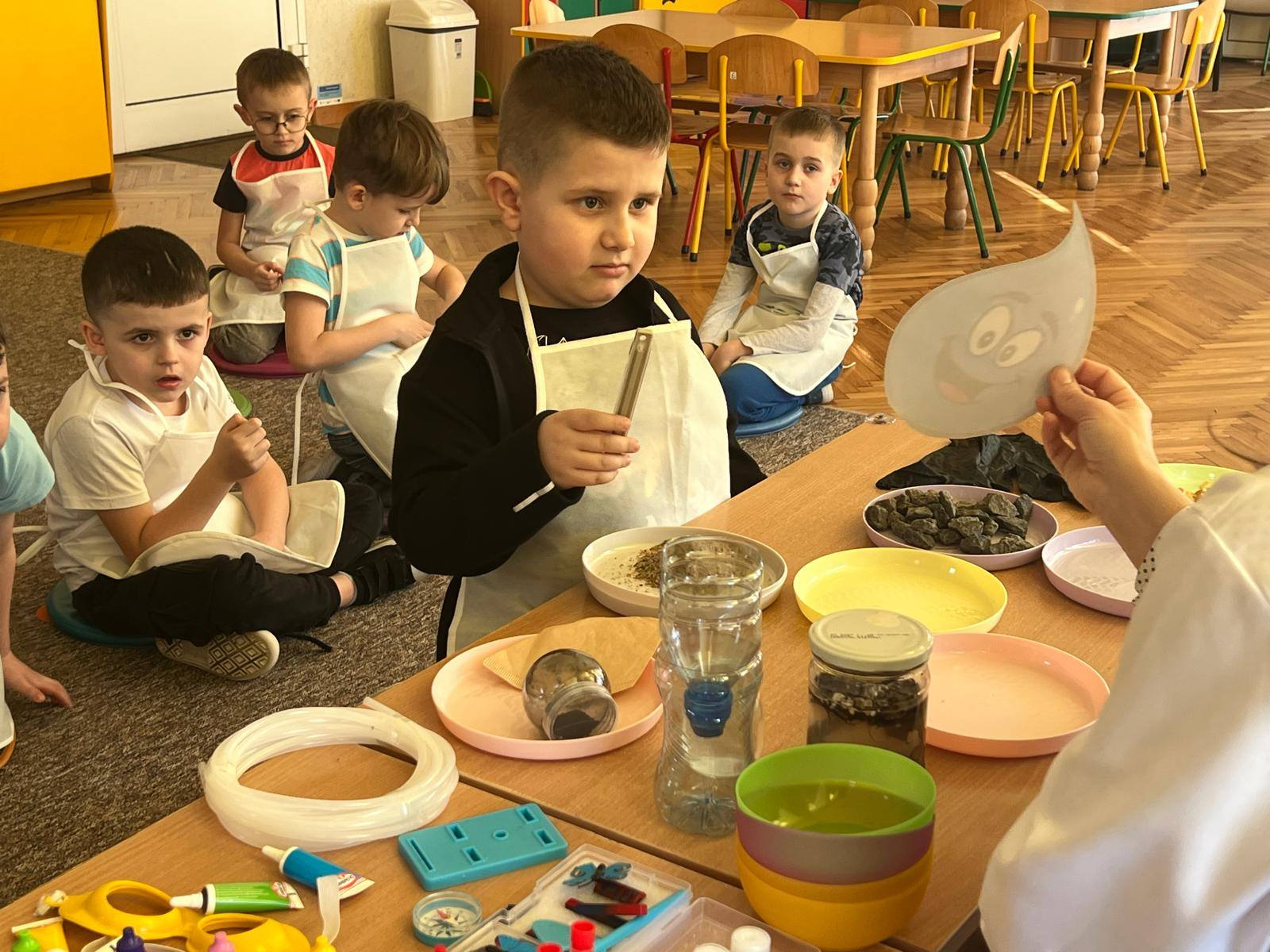 Zajęcia z cyklu „Podróż Niebieskiej Kropelki”. Całość realizowana jest w ramach programu badawczego, który pozwala dzieciom odkrywać tajemnice przyrody poprzez zabawę i doświadczenia.